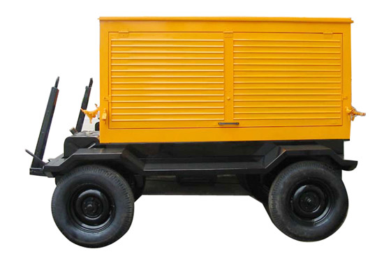 拖車車架采用槽梁焊接成框架結構,節點選擇合理、強度高、剛性好;同時裝有鋼板彈簧懸架結構;拖車采用高度可調節插銷式牽引架,適用于各種高度牽引車;采用圓形鋼管焊接直通式車軸,結構緊湊,安全可靠;車架四角設有機械式支撐裝置,配備慣性行車制動、駐車制動和脫離應急制動,確保機組在各種狀況下的安全;車架前端設有支撐輪,具備承受機組垂直載荷的功能的同時還具備導向功能;整車配備轉向和剎車指示燈,同時裝有尾燈標準插頭。.
